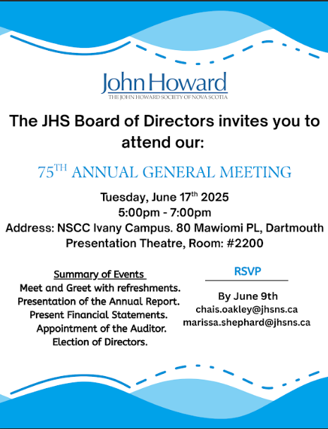 The John Howard Society of Nova Scotia is nationally-affiliated and connected to 65 regional offices across Canada. We offer support, compassion, and practical help to all people regardless of background. As a non-profit charity, we are governed by a volunteer board of directors. Our current Board Members and latest Annual Report and Meeting Minutes follow. For any other years, contact us at the numbers below.